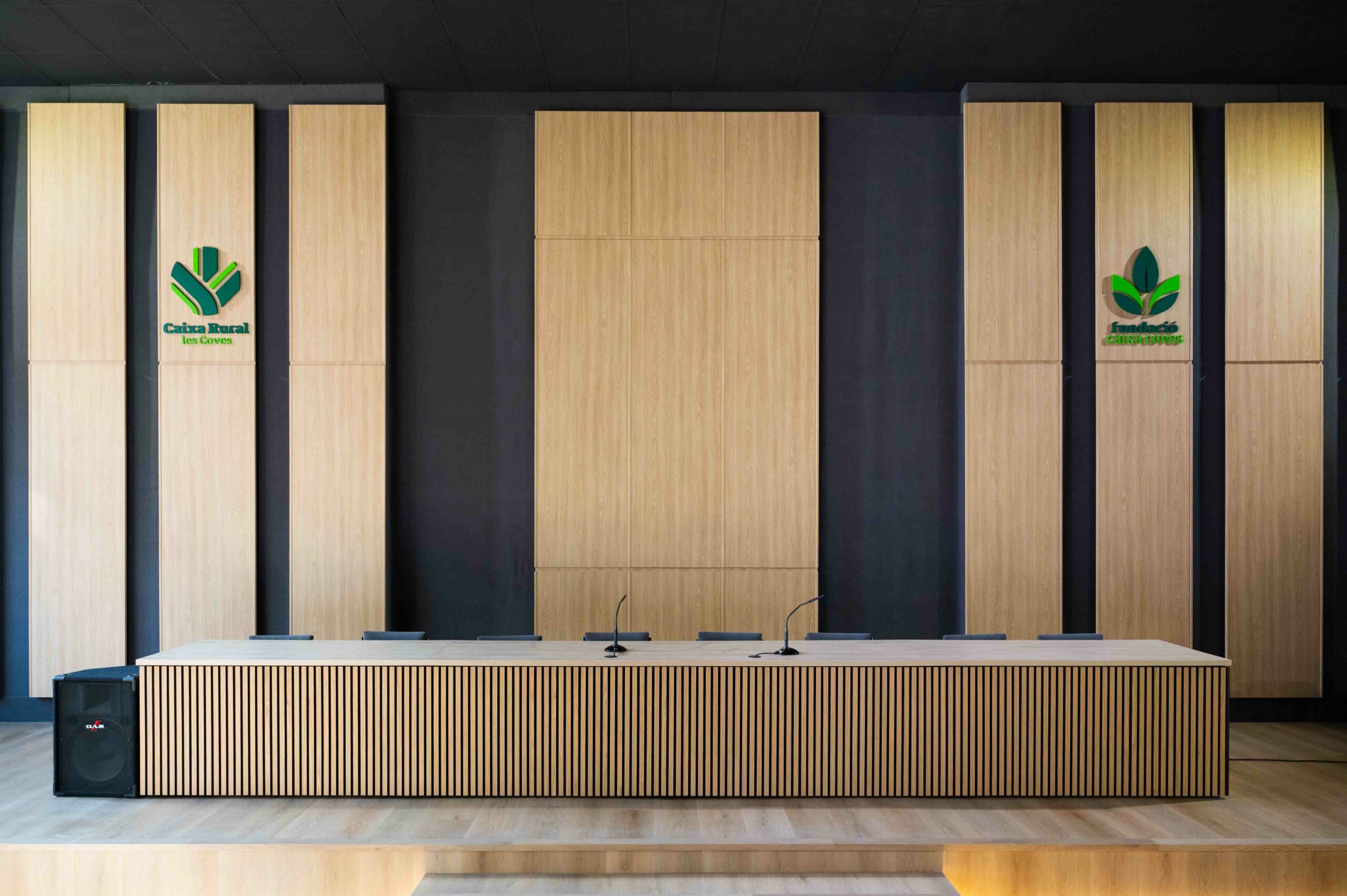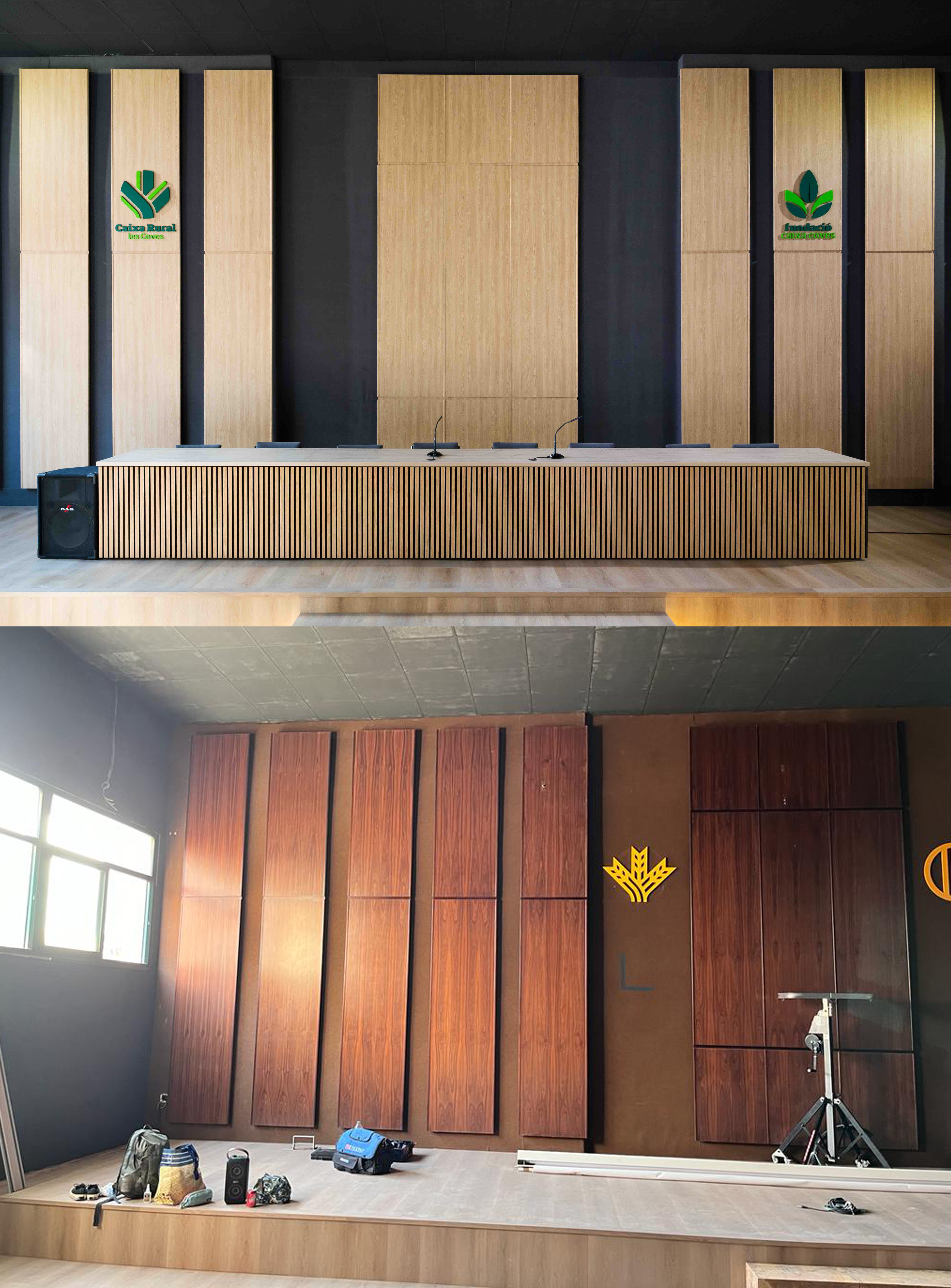 Reforma del saló d’actes: folrat de mobiliari i panells murals amb vinil decoratiu acabat fusta, instal·lació de lletres corpòrees i icones per la senyalètica de l’espai.