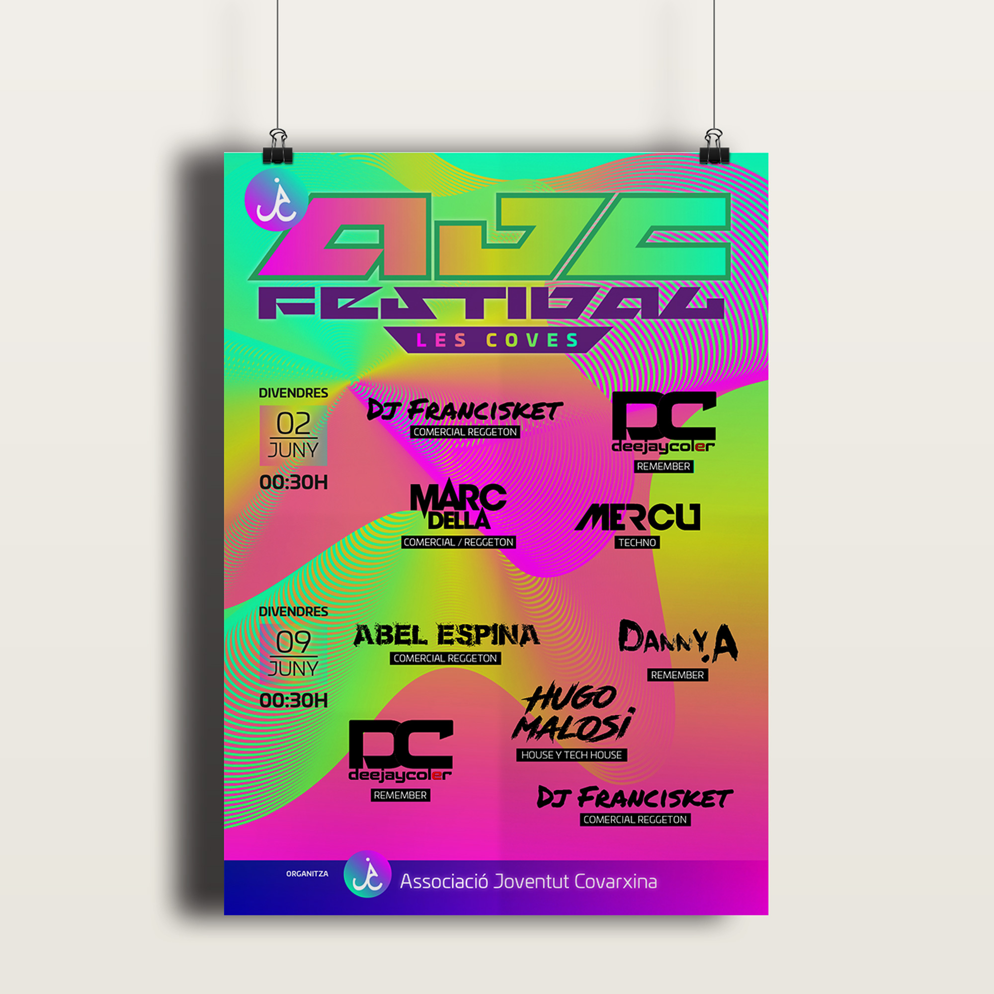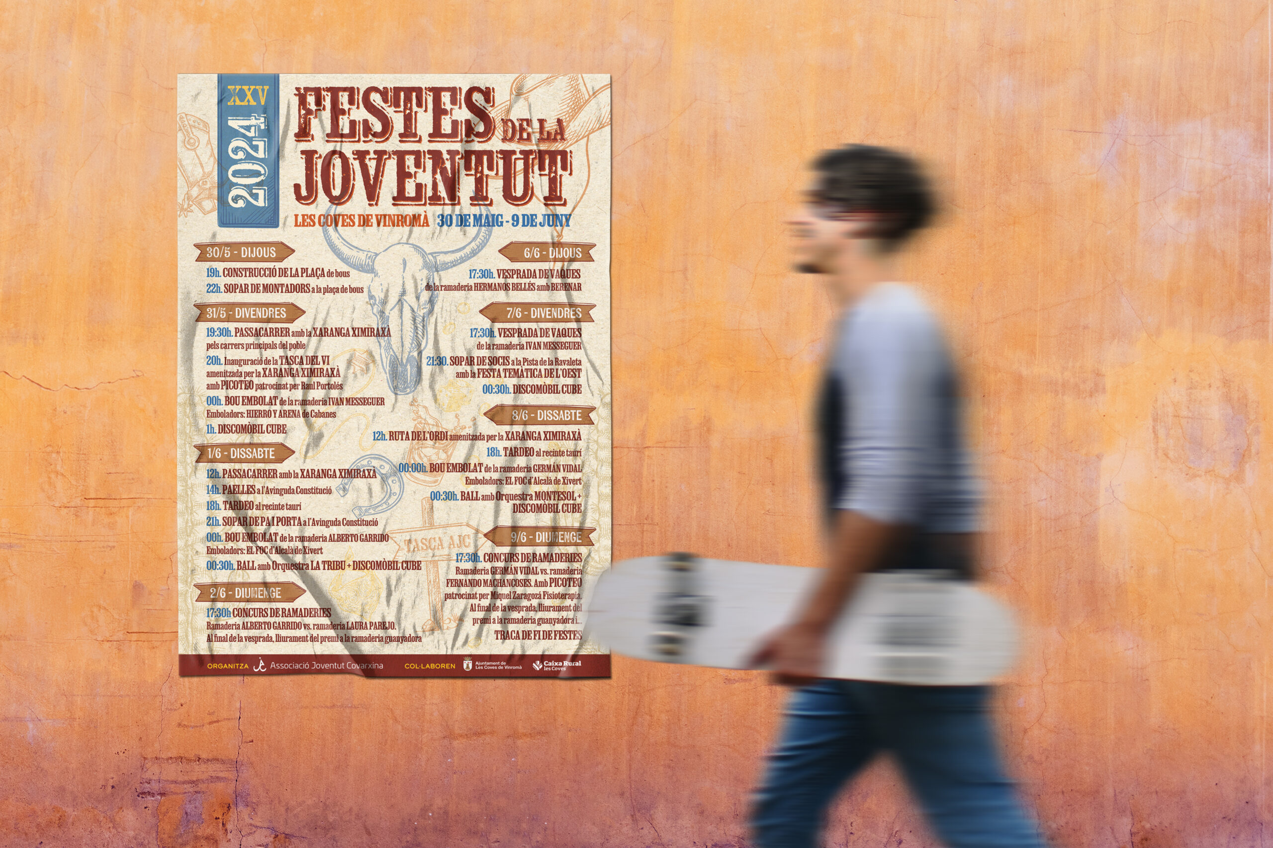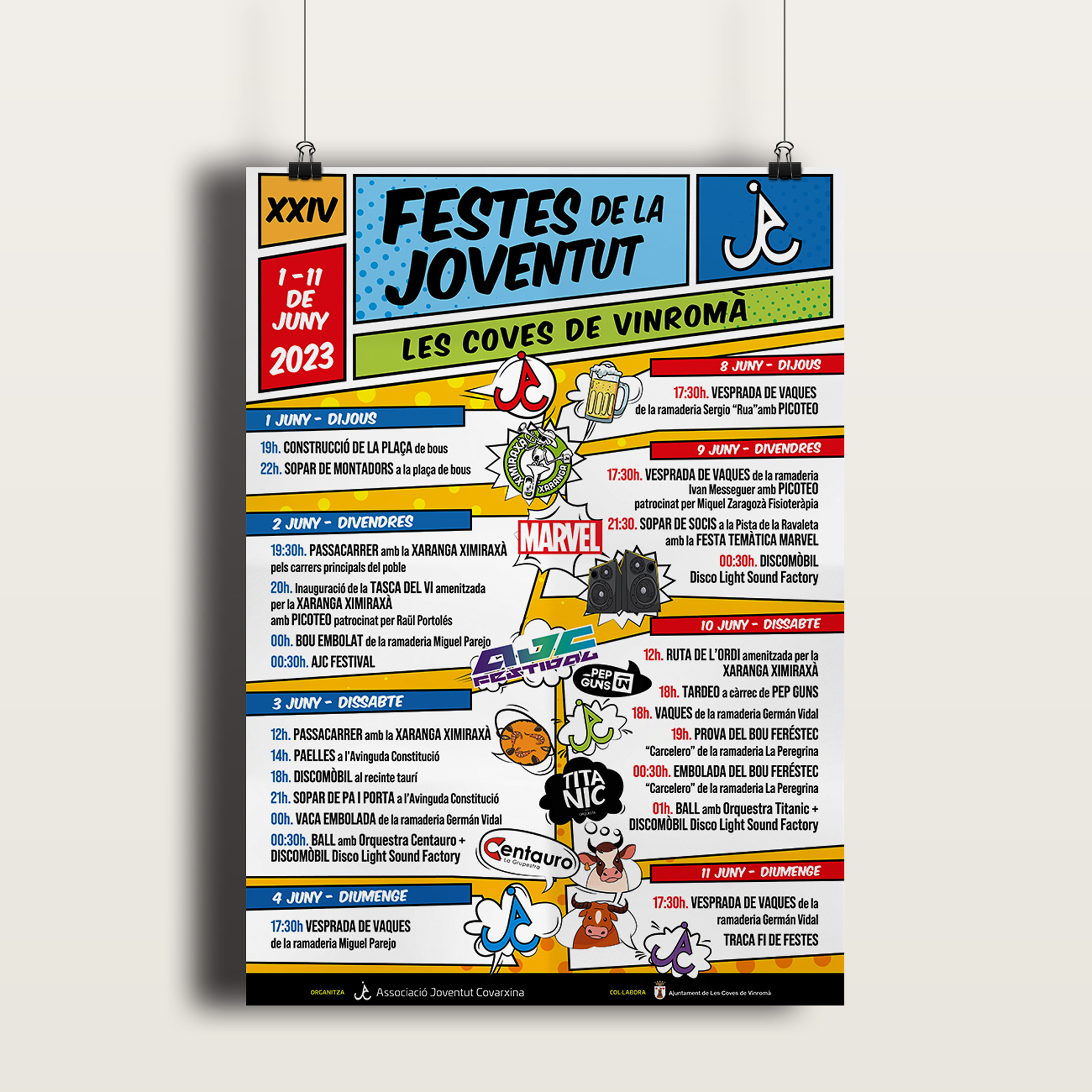 L’any 2023, l’AJC ens va demanar el disseny de la cartelleria de les Festes de la Joventut de les Coves de Vinromà.